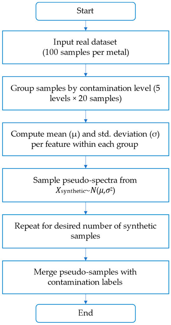 To the best of our knowledge, while data augmentation techniques are common in imaging and text-based machine learning domains, their application to LIBS-based elemental analysis remains scarce. No prior LIBS studies—including [5,6,16]—reported the use of normal-distribution-based sampling to generate synthetic data for model training. Our method addresses this gap by sampling synthetic pseudo-spectra from Gaussian distributions defined by the mean and standard deviation of each feature, grouped by contamination level. This approach preserves spectral variability while maintaining class balance. Figure 2 shows the implemented procedure, which allowed the generation of 500 synthetic samples per metal for model training.