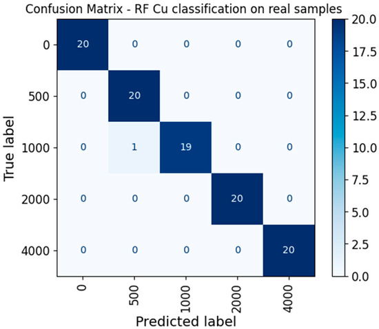 To further validate that the classification model for copper was not overfitting to noise patterns, we computed a confusion matrix using only real samples for testing and only augmented samples for training. As shown in Figure 3, the random forest model accurately classified most test samples from each contamination level (20 per class), yielding an almost perfect diagonal with only one misclassification. This result supports the claim that the model’s high performance is not due to indiscriminate classification, but rather to its ability to separate spectral patterns across contamination levels. These findings are consistent with the stability observed in cross-validation accuracy reported earlier.
