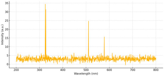 A representative LIBS emission spectrum for a copper-contaminated mulberry leaf sample is shown in Figure 4. The most intense emission lines near 324.75 nm and 327.40 nm correspond to characteristic copper transitions. This spectrum was obtained by averaging 80 individual laser-induced measurements, consistent with the dataset used in this study. The illustrated spectral features were considered during model training and feature selection.