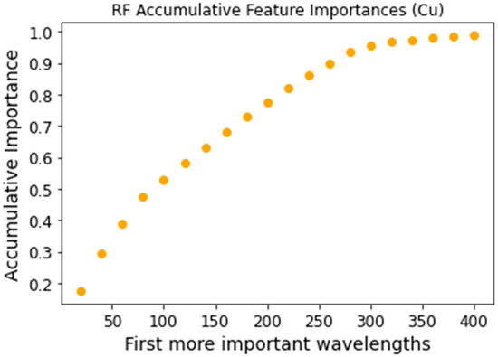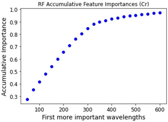 Feature selection was performed using the feature_importances attribute of the RF classifier from the scikit-learn package. This method assigns each feature a value between 0 and 1, known as the Gini importance, with the sum of all feature importances equaling 1. To select the most relevant features, we identified the top n features whose cumulative importance reached a predefined threshold of 0.95. Figure 5 and Figure 6 illustrate the cumulative sum of the most significant Gini importance values for the chromium and copper datasets, respectively. The 0.95 threshold was reached with the 500 most important features for chromium and the 300 most important features for copper.