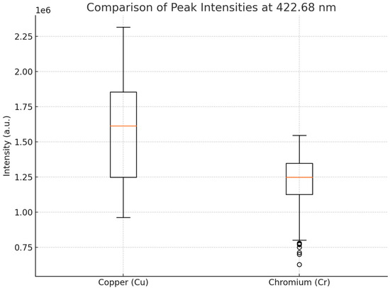 Boxplot comparison of peak intensities at 422.68 nm for copper (Cu) and chromium (Cr) datasets.