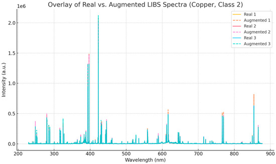 To assess the realism of the synthetic data generated via normal distribution sampling, we compared representative LIBS spectra from the copper dataset with their corresponding augmented counterparts. Specifically, three real spectra from class 2 were overlaid with three augmented spectra generated from the same class using mean and standard deviation statistics. As shown in Figure 8, the augmented spectra preserve the overall peak structure and intensity profile observed in the real data, while incorporating controlled variability. This result confirms that the data augmentation process respects the physical characteristics of LIBS signals and supports its use as a strategy to enrich small datasets without introducing artifacts.