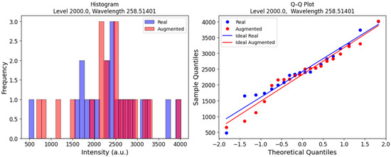 To further support the validity of our data augmentation strategy, we analyzed the intensity histograms for both the real and synthetic samples. Figure 9 (left) presents an example of the distributions for class 3 at a wavelength of 258.51401 nm. The histograms for both the augmented and real data exhibit a shape that resembles the expected bell curve of a normal distribution. Additionally, the Q-Q plots for each distribution are shown in Figure 9 (right). In these plots, the points closely align with a straight line, indicating that both distributions are normal. Furthermore, the intercepts and slopes of the fitted lines are similar, suggesting that the means and standard deviations are also close. This observation reinforces the rationale for using the central limit theorem to justify the application of normal distribution-based sampling for LIBS data augmentation.