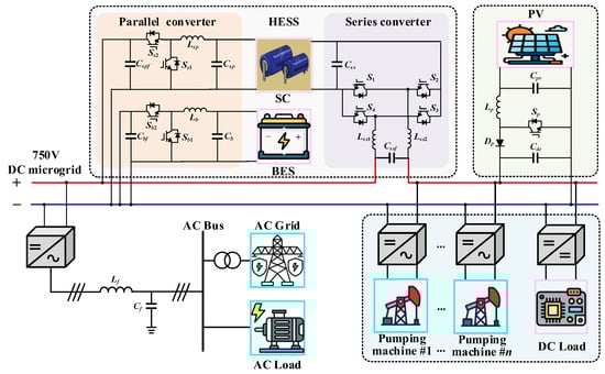 The overall architecture of the proposed hybrid energy storage system is shown in Figure 1. The system is mainly divided into three parts: the power supply part, the load part, and the energy storage part. The power supply part is composed of the AC grid and PV power generation. The AC grid is connected to the DC bus through an AC-DC converter, and the PV power generation is connected to the DC bus through a DC-DC converter. The load part is composed of DC load and oil pumping load, in which the DC load is connected in parallel to the DC bus through a DC-DC converter to supply power, and the oil pumping unit is connected in parallel to the DC bus through an AC-DC converter. The oil pumping unit can be operated in two operating modes: the electric generator and the electric motor. The energy storage part is a supercapacitor-battery hybrid energy storage compensation system employing the proposed series-parallel compensation topology. Based on the functional differences between voltage compensation and power compensation, the supercapacitor-battery energy storage compensation system is decomposed into a series compensation module and a parallel compensation module.