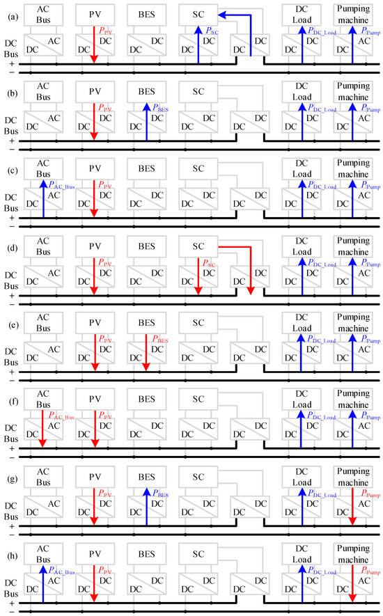For the pumping load, it can operate in two modes: motor mode and generator mode. In motor mode, the oil pumping unit is powered by a combination of photovoltaics, batteries, supercapacitors, and an AC microgrid. In generator mode, the oil pumping unit returns excess energy to the DC bus, and the system absorbs the energy through hybrid energy storage by supercapacitors and/or batteries. When they are also saturated, the excess energy is fed back to the AC grid.