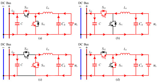 Figure 3a,b represent two operational transients within each switching cycle during the energy storage discharging mode. In Figure 3a, the energy storage primarily charges the inductor through Sb1, with minimal current output to the DC microgrid. To simplify the analysis, the influence of this discharging transient on the energy storage is neglected. Consequently, the voltage equations remain identical during both charging and discharging transients, allowing the analysis of either case to suffice.