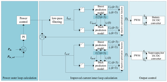 Based on the fundamental control concept of hybrid energy storage, this paper integrates a power outer-loop control with an MPC current inner-loop control featuring delay compensation to enhance the current inner-loop, thereby forming a dual closed-loop control structure. The power outer-loop provides a reference current for the current inner-loop, while a low-pass filter is designed to decompose the compensation current of the hybrid energy storage, obtaining the high- and low-frequency components of the reference current for the supercapacitor and battery. Further, the control signals for the converter are derived through model predictive control. The dual closed-loop control structure is illustrated in Figure 4.