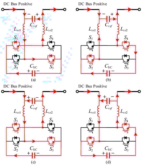 Depending on the conduction states of power switches S1 to S4, the full-bridge converter exhibits two operational transients in each operating mode. Taking the supercapacitor discharge as an example, these are illustrated in Figure 6a,b. To simplify the analysis, inductors Lss1 and Lss2 are collectively considered and defined as Lss. When S1 and S3 are turned on while S2 and S4 are turned off, the equivalent circuit equation for the supercapacitor discharge loop is expressed as