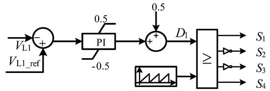 Figure 7 presents the control strategy diagram of the supercapacitor series converter. Measured load voltages serve as input signals. Proportional-integral (PI) controllers regulate the discrepancies between reference and actual signals. The PI controllers generate the output duty cycle D1 by adding an offset constant of 0.5. Comparing the duty cycle D1 with the triangular carrier yields the control signals for S1~S4.
