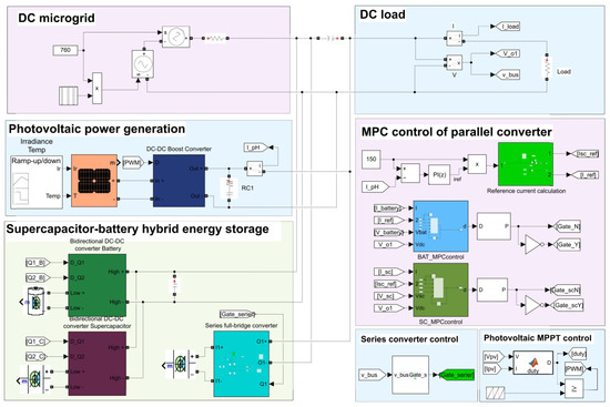 The operation mode of the overall system is mainly divided into two modes: night and daytime. During the daytime, the system is powered by both the PV and the AC grid, while at night, it is mainly supplied by the AC grid. In the daytime operational mode, the system gives priority to using PV for power supply. When power fluctuations occur in the DC microgrid bus, the supercapacitor is the first-choice device for compensation. In cases where the supercapacitor cannot supply sufficient power, the system then resorts to the battery for compensation. If the battery’s power supply is also inadequate, the system utilizes the AC microgrid to compensate for the power deficit. During the nighttime operational mode, the system relies solely on the AC microgrid for power supply. In the event of additional load power fluctuations, the system can also employ the battery or supercapacitor for a certain degree of compensation.