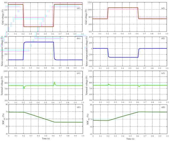 Case 1: A voltage sag event with an amplitude of 600 V (0.8 p.u.) occurs on the grid-side input voltage and lasts 400 ms, as illustrated in Figure 9(a1).
