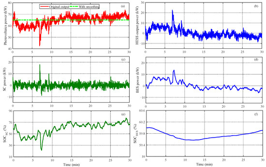 Photovoltaic power smoothing performance of HESS. (a) Photovoltaic power, (b) HESS power, (c) SC power, (d) BES power, (e) SOC of SC, (f) SOC of BES.