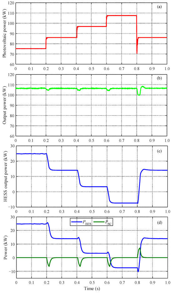 As shown in Figure 11a, the simulation of photovoltaic systems under extreme operating conditions with shading is presented. During the time interval from 0.2 s to 0.8 s, a step disturbance in the photovoltaic output power is introduced. The supercapacitor-battery energy storage system is controlled to maintain a constant output power target from the PV. At the moments of 0.2 s, 0.4 s, and 0.6 s, following a 10-kW fluctuation in the photovoltaic output power, as illustrated in Figure 11c, the hybrid energy storage system promptly compensates by delivering 10 kW of power, stabilizing the photovoltaic output at 107 kW. Notably, during the instantaneous change in photovoltaic output power, the supercapacitor effectively compensates for the entire power fluctuation. As depicted in Figure 11d, within the subsequent 30 milliseconds, the battery output is gradually adjusted to the target compensation value, while the supercapacitor output power is progressively restored to zero. Figure 11b illustrates that throughout the entire simulation period, the photovoltaic output remains stable under the power compensation of the hybrid energy storage system, exhibiting only minor fluctuations at the moment of power transition. This validates the effectiveness of the supercapacitor-battery energy storage parallel compensation module in smoothing the output power of renewable energy sources.