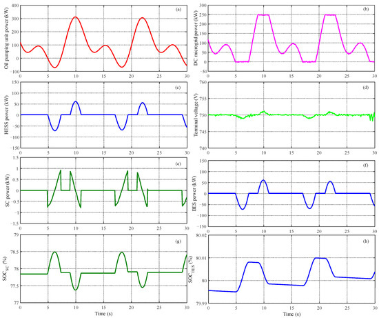 Compensation performance of HESS under oil pumping unit operation. (a) Oil pumping unit power, (b) DC microgrid power, (c) HESS power; (d) Terminal voltage, (e) Supercapacitor power, (f) Battery power, (g) SOC of supercapacitor, (h) SOC of battery.