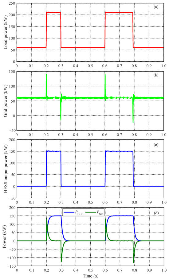 To further validate the universality and adaptability of the proposed series-parallel hybrid energy storage compensation scheme combining supercapacitors and batteries, additional performance verification was conducted for pulsed load scenarios, as illustrated in Figure 13. In the case study, pulsed power loads with an amplitude of 100 kW were applied at 0.2 s and 0.6 s, with durations of 100 ms and 200 ms, respectively. As shown in Figure 13b–d, during the operation of pulsed loads, the supercapacitor and battery energy storage systems rapidly released energy to compensate for the abrupt power variations, ensuring stable power transmission on the grid side while mitigating power disturbances caused by load fluctuations in the DC microgrid. The transmission power of the DC microgrid exhibited fluctuations only during the transition phases of supercapacitor and battery power output, subsequently returning to normal operation.