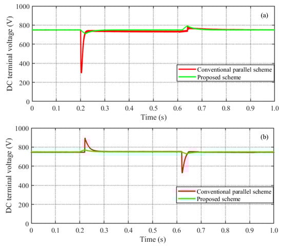 To demonstrate the advantages of the proposed hybrid supercapacitor-battery energy storage series-parallel compensation scheme over conventional technical solutions, a comparative analysis was conducted between the voltage compensation and power regulation performance of the proposed approach and conventional schemes, considering the distinct functionalities of series and parallel compensation modules. As shown in Figure 14, this study’s supercapacitor series compensation approach demonstrates superior performance compared to traditional battery energy storage systems configured in parallel. In the comparative case studies of voltage sag and swell shown in Figure 14a,b, due to the limited power compensation capability of conventional battery energy storage in parallel configuration, significant instantaneous voltage drops were observed in the DC bus voltage during both fault inception and recovery transients. For instance, as depicted in Figure 14a, during the voltage sag fault, the DC bus voltage rapidly dropped to a minimum of 314 V in the initial transient phase before gradually recovering to 750 V. In contrast, the proposed supercapacitor series compensation scheme, functioning as a voltage-type direct compensation method, enables faster and higher-power compensation, effectively confining the instantaneous DC bus voltage fluctuations within ±5%. This approach successfully addresses the transient voltage peak fluctuations caused by the sluggish response of traditional battery systems.