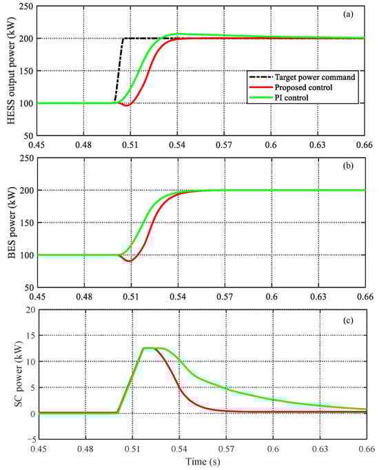 In terms of the parallel power compensation regulation performance of the supercapacitor-battery hybrid energy storage system, a case study was conducted to compare the proposed power-current dual-loop control scheme, incorporating the current inner-loop model predictive control with the conventional PI control scheme. As illustrated in Figure 15, in response to power regulation commands, the proposed control scheme demonstrates smoother tracking and lower overshoot compared to the traditional PI control. Although the PI control scheme initially exhibits faster incremental power output from the battery, its overall stabilization time is prolonged, primarily due to the extended recovery time of the supercapacitor. Overall, the proposed control scheme achieves the power regulation target more rapidly, demonstrating its effectiveness and superiority.