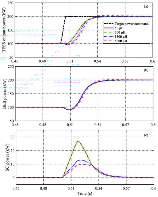Comparative analysis of HESS response performance under different inductance parameters for the proposed control scheme. (a) HESS power, (b) BES power, (c) SC power.