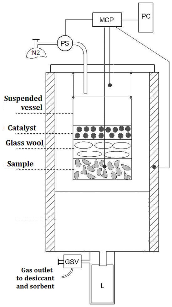 The biomass samples were pyrolyzed in a laboratory unit consisting of a sealed pressure cylindrical reactor, sample vessel, thermocouple system, pressure sensor, relief valve, measuring panel and control and registration PC (Figure 1). The sealed stainless-steel reactor, with an internal volume of 500 cm3 and designed for pressures up to 50 bar, is closed with a steel lid and a flange with a special polymer seal and equipped with a valve for gas sampling. A 90 cm3 cylindrical stainless-steel vessel containing approximately 25 g of sample (grain size 2–3 mm) and 5 g of catalyst is suspended inside this reactor, with the sample positioned approximately at the center of the reactor. Before the experiment, the reactor is flushed with an inert gas, then a temperature of 550 °C is applied to the wall of the reactor. The sample thus reaches 400 °C (end temperature) in about 30 min, while the pressure of the resulting gas reaches a maximum of 18 bar. Subsequently, the reactor heating is turned off and the reactor is allowed to cool to room temperature. The liquid product is collected in a cooled, calibrated glass vessel at the bottom of the reactor. After pyrolysis, the total gas passes through alumina pellets (desiccant) and a commercial carbon sorbent (CO2 sequestration) and is analyzed as the gas obtained (resulting gas). The reactor is then disassembled, and the resulting biochar and liquid products are weighed and analyzed; the total gas is determined by difference.