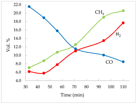However, completely different results were achieved using the second catalyst tested, i.e., in the case of Pd/C catalysis. In this case, the methane content was very low, but the hydrogen content was high, 72 vol.% for AS pyrolysis and 75 vol.% for WS pyrolysis, which is an unexpected finding. Thus, with Pd/C, the utility properties of the gas obtained, namely, higher heating value (HHV), lower heating value (LHV) and gas density (d), were significantly reduced; on the other hand, hydrogen-rich gas was obtained for further utilization.