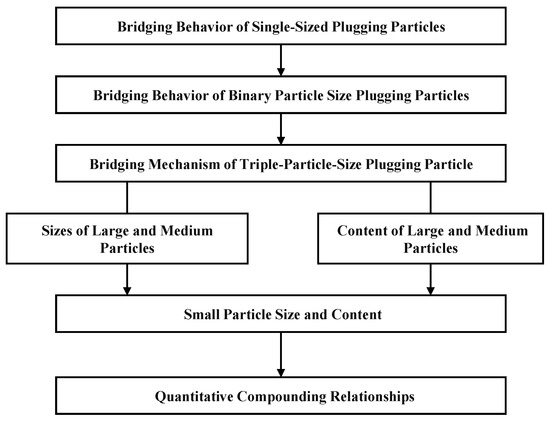 However, most of the aforementioned bridging LCM design methods did not explicitly define the quantitative compounding relationship between the characteristic particle sizes of the LCMs. With increasing drilling depth, the geological environment becomes increasingly complex, and the scales of lost circulation fractures diversify, making the multi-component bridging lost circulation material compounding technology an inevitable choice in drilling operations [14,15]. Currently, the selection of bridging LCMs for complex-scale lost circulation fracture networks still relies on experience and has not fundamentally solved the scientific problems involved in compounding multiple LCMs [16], resulting in the lost circulation problem not being effectively controlled or eliminated. In view of this, this paper, focusing on the basic characteristics of fractured lost circulation and utilizing a modified PPT fractured lost circulation experimental apparatus, conducted indoor bridging lost circulation experimental research, aiming to explore and establish a quantitative compounding method for multi-sized rigid LCMs. Specifically, this study investigated the synergistic bridging and sealing effects of different particle size fractions based on their size-to-fracture width ratio R (R = D50/w), leading to the development of a specific quantitative relationship for a triple-particle system. This approach, grounded in experimental validation and supported by particle packing theory, provides a more scientific and direct basis for the design of rigid bridging LCM formulations for fractured formations, addressing the limitations of current empirical or qualitatively-guided methods. The flowchart of this article is shown in Figure 1.