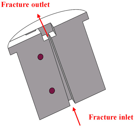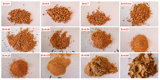 The permeability plugging apparatus (PPA) is a commonly used method for leak-off evaluation [17], but conventional PPA testing is primarily used to assess pore plugging or the absence of deep fractures. This does not align with the characteristics of leakage pathways in fractured formations. The apparatus used in this study was modified based on the PPT Permeability Plugging Tester. The improved PPT fractured lost circulation tester primarily included key components such as a lost circulation slurry chamber, a fracture block (see Figure 2), and a hydraulic pump. Specifically, the geometric parameters of the fracture block were a fracture inlet width of 3 mm, an outlet width of 1.5 mm, and a length of 40 mm; the direction of fluid flow was from bottom to top. In the experiment, the selected rigid bridging LCM was nut shells. Due to their high strength, low density, and good environmental compatibility, nut shells have become one of the most widely used bridging LCMs currently [10]. To thoroughly investigate the quantitative compounding relationship of rigid LCMs of various sizes, this study, based on the ratio of rigid bridging lost circulation material size to the fracture inlet width (abbreviated as: particle size-to-fracture width ratio, i.e., R = D50/w, where D50 is the median particle diameter and w is the fracture inlet width), divided the rigid LCMs into 12 grades. The specific grading details are shown in Figure 3. During the experiment, a slow and intermittent injection method was employed to inject the lost circulation slurry into the fracture. The specific operating procedure was as follows: After increasing the pressure by 1 MPa, that pressure was maintained for 5 min until the sealing layer was broken, at which point the experiment was stopped. The maximum pressure bearing capacity of the sealing layer was determined by the pressure value displayed on the pressure gauge just before the sealing layer broke. The criterion for judging the failure of the sealing layer is that during continuous injection, the pressure on the pressure gauge remains constant for a prolonged period. This experimental method can effectively simulate the process of LCMs migrating, accumulating, and sealing within fractures during actual drilling operations, providing scientific and accurate experimental means for studying the performance of LCMs.