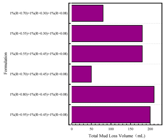 Figure 6 shows the impact of compounding triple particle size plugging materials on the total fluid loss. It can be seen that the total lost volume in all triple particle combination experiments is less than 200 mL. This indicates that the combined composition of large, medium, and small particles can significantly improve bridging and plugging efficiency, achieving effective sealing of lost circulation fractures. However, when the size of large particles is too large (corresponding to the data for R = 0.8 and 0.9 in Figure 6), some particles may be intercepted or obstructed at the fracture inlet, affecting their smooth entry into the fracture interior. This prolongs the time required for the lost circulation fracture to be bridged and sealed, and leads to a larger total lost volume. This phenomenon is mainly attributed to the large aspect ratio characteristic of rigid LCMs. The size of the largest particles also plays a critical role in the efficiency of primary bridge formation. Particles with an R-value close to 0.70 were optimally sized for initiating a robust primary bridge in our experimental setup, leading to rapid sealing and minimum lost volume. When the size of large particles is too small (corresponding to the data for R = 0.55 in Figure 5), it affects the bridging speed, and the final lost volume is also relatively high. Overall, for lost circulation fractures of a certain width, the bridging and sealing effect of triple particle size combined plugging materials is significantly better than that of binary particle size combined plugging materials.