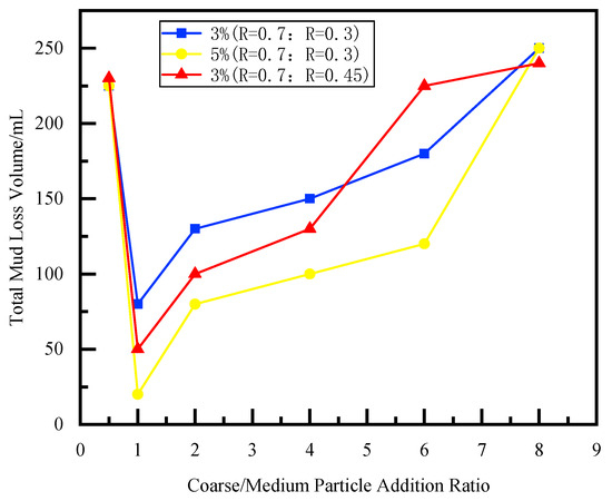 To further enhance the sealing effect of triple bridging and plugging particles on fractures, this study further investigated the influence of the proportion of triple bridging and plugging particles on the total lost volume. Figure 7 reveals the influence of the percentage ratio of large particles to medium particles (λ) on the final lost volume. Here, the percentage ratio λ is defined as the ratio of the percentage content of large particles to the percentage content of medium particles in the compounded mixture: λ = (%Large Particles)/(%Medium Particles).