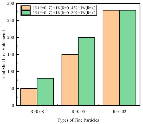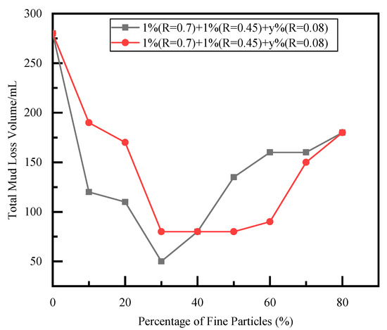 Figure 8 shows the influence of small particle size on the total lost volume. It can be seen that as the size of small particles decreases, their bridging and sealing effect when combined with large and medium particles gradually decreases. Only when the small particle size is R = 0.08, after mixing with the already combined large and medium particles, the plugging effect is optimal, and the lost volume is minimal. Figure 9 shows the influence of the percentage of small particles on the total lost volume. It can be seen that when the percentage of small particles is around 30%, the lost volume reaches a minimum. From this, the following can be inferred: