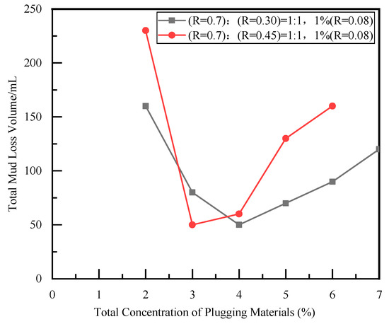 Figure 10 demonstrates the influence of the total concentration of plugging material on the total lost volume. The research findings are as follows: