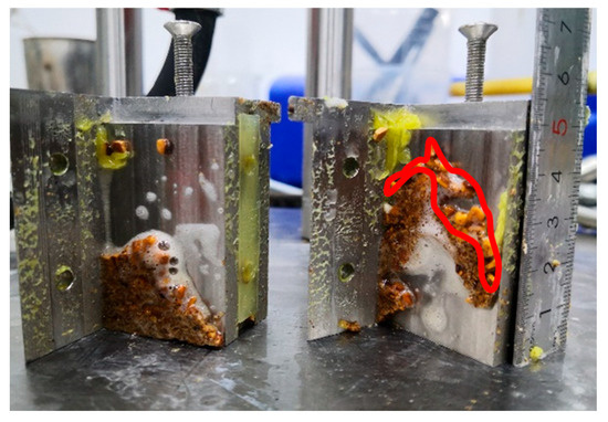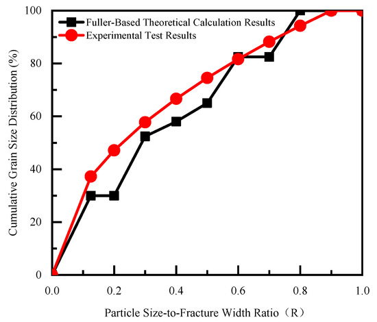 Based on the aforementioned compounding relationship, this study plotted the cumulative particle size distribution curve of the lost circulation material, with the particle size-to-fracture width ratio as the x-axis and cumulative particle size distribution as the y-axis, and compared it with theoretical values. As shown in Figure 11, the cumulative particle size distribution curve based on the Fuller curve is basically consistent with the experimental cumulative particle size distribution curve of the plugging particles. This indicates that the lost circulation material designed using the quantitative compounding relationship for LCMs obtained in this study can form a dense sealing layer within the fracture through bridging (see Figure 12), thereby effectively preventing the loss of drilling fluid. In summary, this study further validated the quantitative compounding relationship for rigid bridging plugging particles in fractured lost circulation through plugging experiments with different fracture widths and particle packing theory.