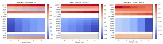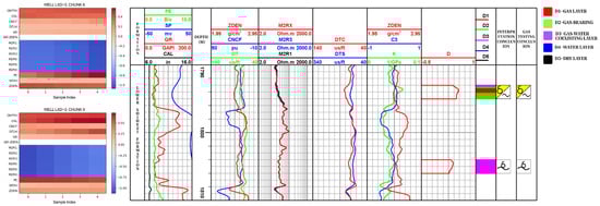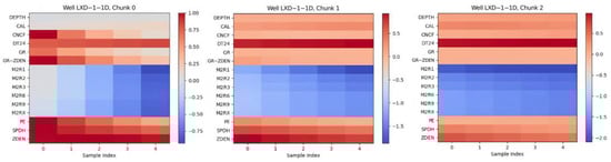 To address class imbalance, a hybrid sampling strategy combining oversampling of minority classes and undersampling of majority classes was adopted to balance the sample distribution and reduce model bias toward dominant categories. The optimized dataset was then split into training, testing, and validation sets in a ratio of 70%, 20%, and 10%, respectively, ensuring reasonable data distribution and fair model evaluation. Additionally, to enhance the model’s perception of spatial patterns in the logging data, multi-channel standardization was applied. Logging parameters were mapped onto RGB channels to generate uniformly formatted thermal maps, as illustrated in Figure 2. This representation preserves the coupling relationships among logging parameters while improving the separability of different reservoir types.