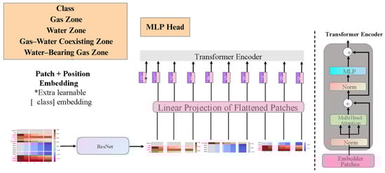 To enhance the accuracy and robustness of fluid identification in tight gas reservoirs, this study proposes a hybrid deep learning model—ResViTNet—that integrates convolutional neural networks (CNNs) with vision transformers (ViTs). The model leverages the local feature extraction capabilities of ResNet and the global context modeling strength of the transformer architecture, enabling efficient and automated fluid classification under complex reservoir conditions. As illustrated in Figure 3, the overall architecture comprises the following four main modules: input preprocessing, ResNet-based feature extraction, positional encoding with transformer encoders, and an output classification layer.