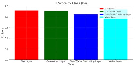 In addition, to evaluate classification performance at a more granular level, the PRF metrics—precision, recall, and F1-score—were adopted, and the F1-scores for each fluid category were presented using bar charts, as illustrated in Figure 5 and Figure 6. These visualizations provide a clear view of the model’s recognition performance across different fluid types [20]. Notably, the model achieves high F1-scores in identifying gas and water zones, whereas more complex categories—such as gas–water coexisting zones—still exhibit some prediction errors.