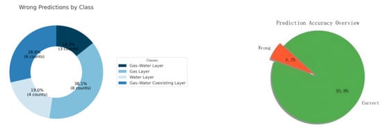 Further analysis (Figure 7) presents that although prediction errors still exist in some categories, the model demonstrates relatively high accuracy in identifying water zones and water-bearing gas zones, further confirming the robustness of ResViTNet in recognizing water-associated fluid layers. To comprehensively evaluate the misclassification behavior, a statistical analysis of the number and proportion of misclassified samples was conducted (Figure 8). The findings indicate that the overall misclassification rate is only 6.2%, with the majority of errors concentrated in the gas–water coexisting class. These results provide a clear insight for future algorithm refinement and data augmentation strategies.