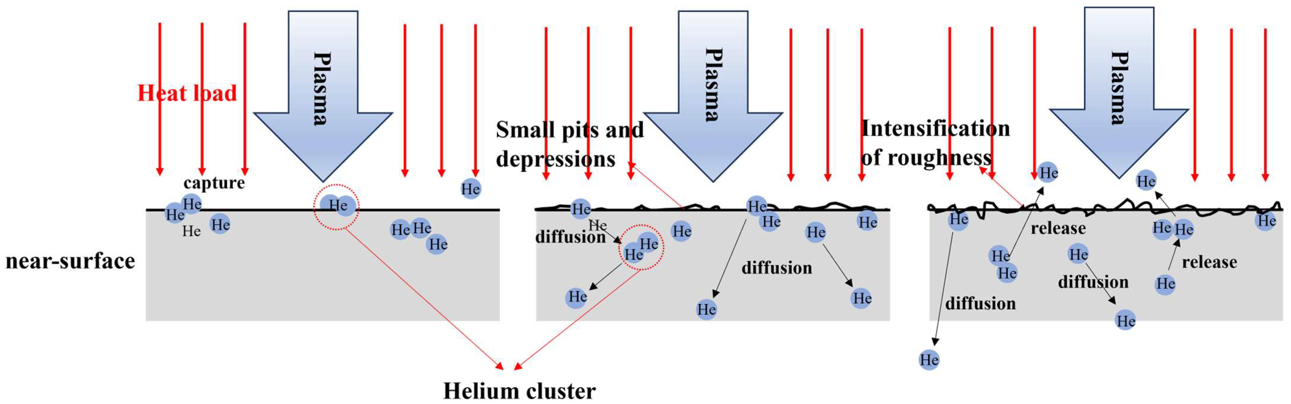 12]. Malykhin et al. further emphasized that a single pulse load may change the surface stress distribution of tungsten materials, thereby affecting the adsorption and diffusion behavior of helium plasma. This complex interaction requires more systematic experimental research and theoretical modeling to be deeply understood [