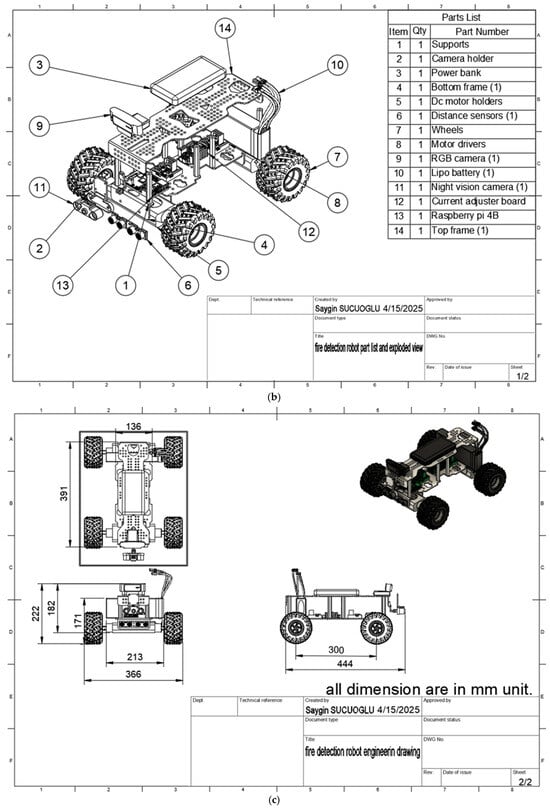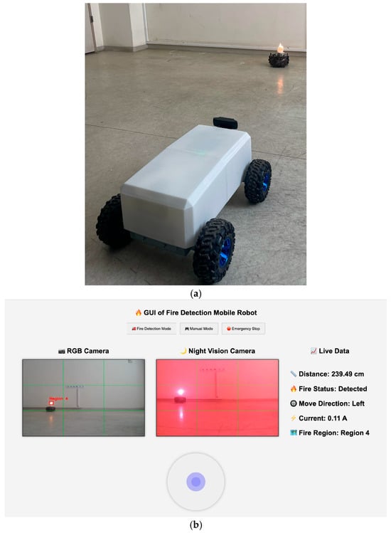 The utilization of mobile robots in performing a variety of tasks that are typically the domain of humans is a subject that has been the focus of much recent research. Such tasks include surveillance, reconnaissance, patrolling, firefighting, homeland security, entertainment, and service [23,24]. Using mobile robotic systems for early fire detection and firefighting has some advantages over fixed systems, including low cost, low maintenance, and the ability to be used for multiple purposes including patrolling, security, and early fire detection. There have been studies in the literature on the design and development of mobile robotic systems for early fire detection and firefighting. Banerjee et al. [25] conducted a research project with the objective of developing a remotely controlled, four-wheeled unmanned ground vehicle with the capacity for real-time sensor data and live video transmission via the internet. The structure of the system was predicated on the utilization of a sophisticated object detection model for the purpose of detecting fires within the live video feed. It has been reported that the integration of YOLOv5, TensorFlow, and OpenCV provides a robust fire detection capability. Kong et al. [26] proposed the development of a video-based fire-fighting mobile robot. The primary function of the robot is to patrol an area of interest and to observe fire-related events in real-time, ensuring the camera remains unobstructed. Ibitoye et al. [27] conducted research on the development of a mobile robot that can detect and extinguish fires without human intervention. They created a robotic structure by integrating multiple sensors such as thermal cameras, gas detectors, and smoke sensors for heat detection. In their study, Nguyen et al. [28] concentrated on the development of a belt-driven mobile robot that was integrated with a machine vision system. This system enabled the robot to navigate across diverse terrains and detect and identify fires.