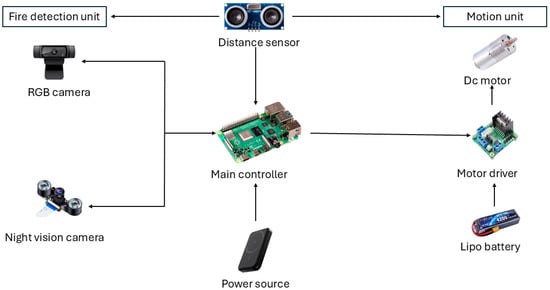 The hardware design process was divided into two sections: motion and fire detection units. The motion unit involved the integration of four 12V DC motors, each with a rotational speed of 130 RPM (revolutions per minute). This was complemented by two L298 motor driver boards, four all-terrain wheels with a diameter of 125 mm, and a LiPo (lithium polymer) battery serving as the power supply (14.8 V, 4200 mAh). The design also included carrier frames and connection elements. The fire detection unit was constructed using a Logitech C920 Pro webcam, a Raspberry Pi 5MP night vision fisheye camera, and a pair of HC-SR04 ultrasonic distance sensors. The Raspberry Pi 4B served as the primary controller for both the motion and fire detection modules. All control functions related to movement, environmental monitoring, and fire detection were executed through algorithmic structures implemented on the Raspberry Pi. A 10,000 mAh, 22.5 W power bank was integrated to supply power to the Raspberry Pi. The utilization of ultrasonic distance sensors was twofold: they were employed for the purpose of obstacle detection, and for the calculation of the distance from the fire source. The ultrasonic sensors had dual functionality: they were used for obstacle detection and distance calculation from the fire source. The schematic diagram of the hardware architecture is depicted in Figure 2.