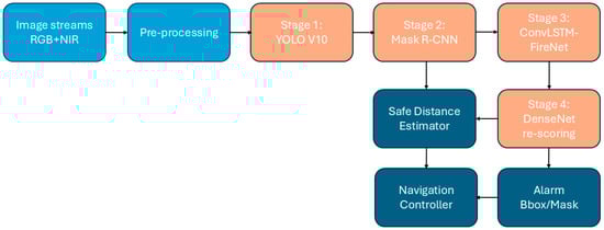 The software pipeline was designed as a four-stage vision stack that maps raw multi-sensor data to a binary “fire/no-fire” alarm, a pixel-accurate fire mask, and an estimated safe-approach radius. Each stage was implemented as an independent Docker micro-service in PyTorch 2.2 and exported to ONNX-Runtime/TensorRT for edge deployment on the Raspberry Pi 4B. The operational flowchart of the hybrid-cascade structure is illustrated in Figure 4.