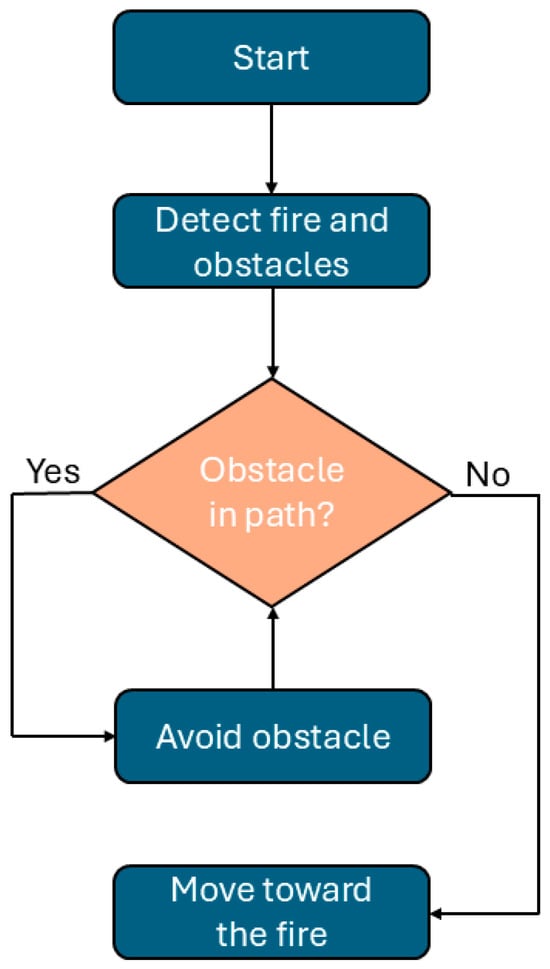 Figure 5 outlines the robot’s motion logic for fire approach and obstacle avoidance. If an obstacle is detected in the direct path, the system re-routes accordingly while maintaining a safe distance. Once clear, the robot proceeds toward the fire. This ensures responsive and safe navigation in environments.