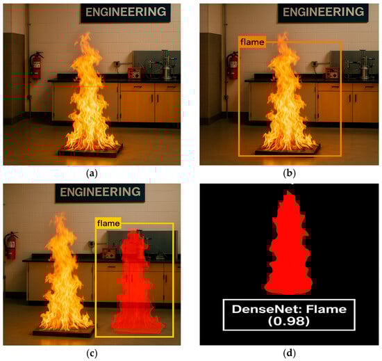 Stage-wise outputs of the hybrid-cascade model: (a) input frame, (b) YOLOv10 detection, (c) Mask R-CNN segmentation, (d) DenseNet re-scoring.