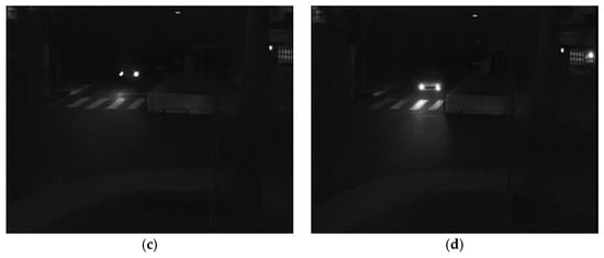 Figure 8 presents a comparison between the system performance on nighttime flame imagery and car headlight interference. While the flame scene was correctly identified as fire (10.a and 10.b), the car light scenario did not trigger a false alarm (10.c and 10.d), highlighting the system’s robustness under common low-light disturbances.