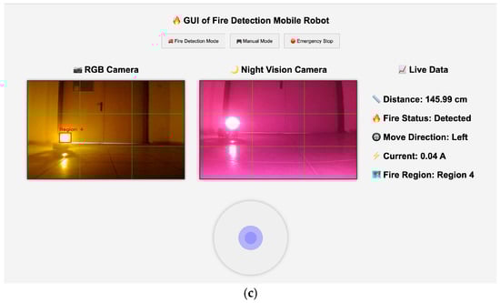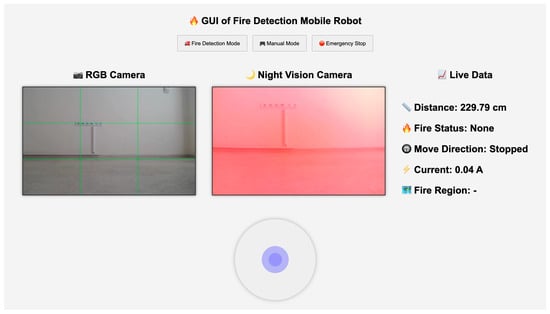 The development of a Graphical User Interface (GUI) was also initiated (Figure 9). The system includes two primary components for image visualization. The first allows the user to view the latest frame captured by the RGB camera, while the second displays the latest frame from the night vision camera. Both components highlight the region where fire is detected. The GUI also features a section that presents tabular data, such as distance to the fire, the current drawn by the system, fire status, and the movement direction of the robot.