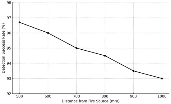 Fire detection success rate at varying distances from the fire source (500–1000 mm).