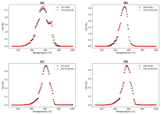 - Gas flow: The experiments were conducted under O2/N2 or O2/10% CO2/N2 flow at the rate of 200 mL/min; the gas compositions used are listed in Table 2.
