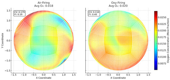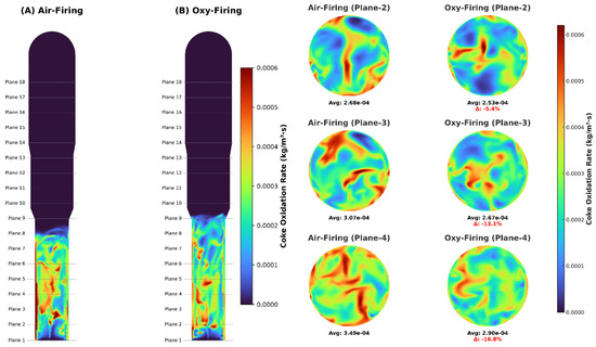 - The binary diffusion coefficient for the O2–N2 pair was higher than that for O2–CO2. This difference was attributed to the significance of external mass transfer, which caused oxygen to be consumed more rapidly under O2/N2 conditions because external diffusion was considered. Conversely, the slower diffusion of oxygen in a CO2-rich environment led to a marginally lower coke oxidation rate.