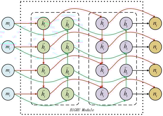 BiGRU [] is an improved version of the gated recurrent unit (GRU), designed as a bidirectional recurrent network that consists of both a forward and a backward GRU. The bidirectional structure allows BiGRU to consider both past and future information in a time series, enabling it to extract more comprehensive fault features from the industrial robot gearbox vibration signals, thus improving the model’s fault diagnosis capability. This structure makes BiGRU perform exceptionally well in many time-series tasks, especially when capturing long-term dependencies and non-stationary signals. Because GRU includes a gating mechanism that controls the flow of information and forgetting through the update and reset gates, BiGRU is more efficient than traditional unidirectional RNNs and GRUs and requires fewer parameters and lower computational cost compared with LSTMs. The following introduces each module in the BiGRU network and the derivation of the relevant formulas.