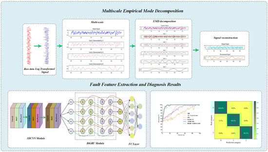 Although the methods mentioned above have demonstrated good performance in fault diagnosis, there are still areas that require further improvement, particularly in noise suppression, feature extraction, and model generalization ability. Fault diagnosis in mechanical systems is crucial in industrial applications, but traditional methods face several challenges. They rely heavily on expert knowledge and manual feature extraction, which makes them ineffective in handling nonlinear and non-stationary signals. Additionally, their sensitivity to noise often results in reduced diagnostic accuracy. Traditional approaches also fail to account for the temporal dynamics in signals, leading to the loss of critical fault information. Furthermore, these methods lack adaptability, making it difficult to apply them across varying operating conditions and mechanical systems. These limitations restrict their use in complex industrial scenarios. To address these issues, this paper proposes a fault diagnosis method that combines multi-scale empirical mode decomposition (MS-EMD) with a one-dimensional convolutional neural network (1D CNN) and bidirectional gated recurrent unit (BiGRU). The approach introduces a multi-scale down-sampling framework to process signals, generating signals at different time scales. EMD is then applied to decompose each scale of the signals, capturing features across multiple frequency bands and time scales. Additionally, frequency energy entropy is used to select key intrinsic mode functions (IMFs) from each scale decomposition, removing redundant components and noise to enhance the stability and representational capability of the signal decomposition. Subsequently, the reconstructed multi-scale signals are input into the 1D CNN in a multi-channel form to leverage its local feature extraction advantages. By combining the powerful sequence modeling capability of the BiGRU, the method enables the precise extraction and classification of fault patterns.
