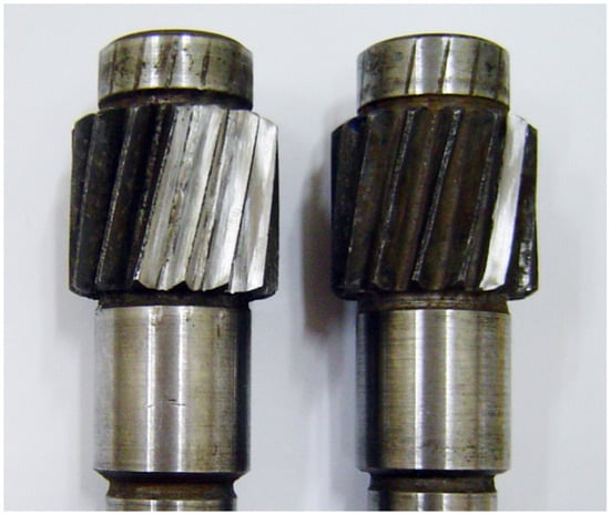 Considering that obtaining real data from industrial robot gearboxes is challenging, we used a publicly available dataset from reference [] for this study. The dataset was collected from an experimental setup of a real industrial gearbox, simulating the working conditions of the gearbox, and records vibration signals under various typical operating conditions. It comprehensively captures the vibration characteristics induced by gear faults. The data include radial vibration signals from three different gear conditions in the gearbox setup: healthy teeth of helical gears, a single tooth gap, and three worn teeth, as shown in Figure 4 and Figure 5. Because the fault types and vibration characteristics of this dataset closely resemble common fault modes in industrial robot gearboxes, it holds significant research reference value. The data acquisition system has a sampling frequency of 10 kHz, with each collection lasting 10 s, providing high-resolution dynamic signals that help capture transient vibration features during fault occurrences. The test gearbox operates at a speed of 1420 rpm, with the small gear having 15 teeth and the large gear having 110 teeth, and a meshing frequency of 355 Hz, which accurately reflects the vibration characteristics during the gear meshing process.