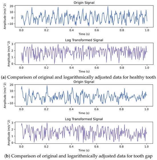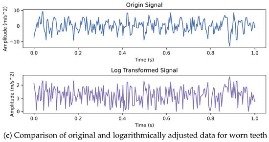This study applied a logarithmic (Log) nonlinear transformation function to the vibration signals of industrial gearboxes, combined with signal standardization. The primary motivation for this approach lies in the characteristics of vibration signals, which often exhibit large amplitude peaks and small background fluctuations. Directly processing the raw signal may cause the model to overly focus on high-amplitude features while neglecting subtle yet important variations. By applying the Log transformation, the dynamic range of the signal is compressed, reducing the influence of large amplitudes while enhancing the relative importance of small-amplitude features, thus achieving a more balanced feature distribution. Moreover, the Log transformation suppresses noise signals to some extent, improving the signal-to-noise ratio. However, it is important to note that the Log transformation itself is not a normalization process—it only adjusts the amplitude proportions of the signal without scaling it to a specific range (e.g., [0, 1] or [−1, 1]). To eliminate differences in magnitude between signals, we further standardized the Log-transformed signal to ensure a more consistent feature distribution. The results of applying the Log nonlinear transform to the healthy tooth, tooth gap, and worn teeth cases are shown in Figure 6.